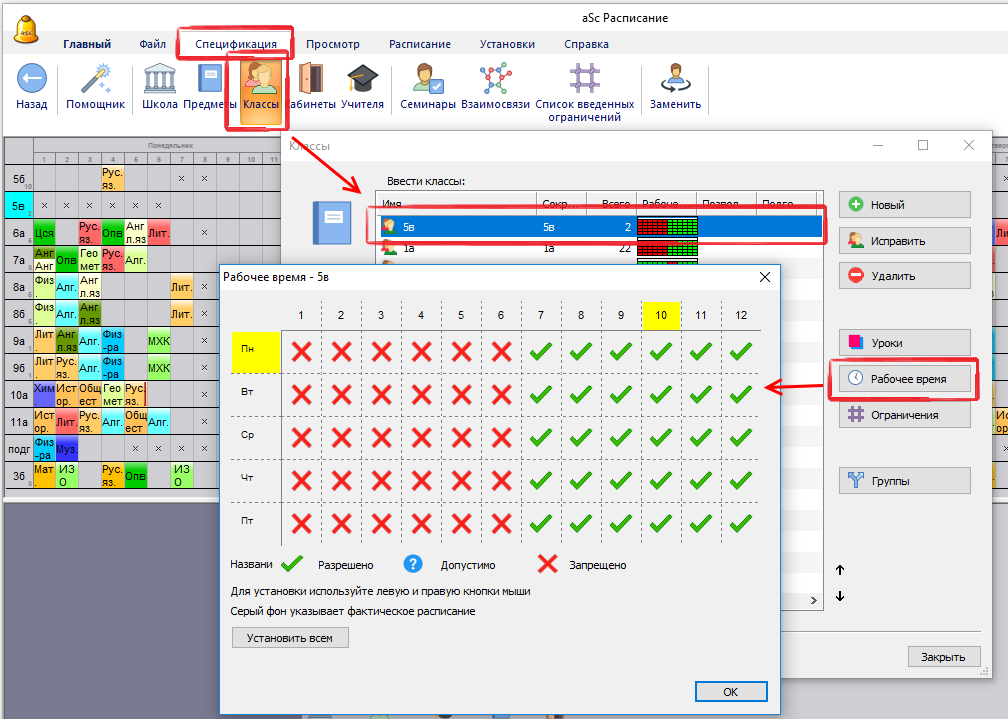 Эту установку рабочего времени с "Установить всем" можете скопировать и другим классам, не нужно вводить каждому отдельно.