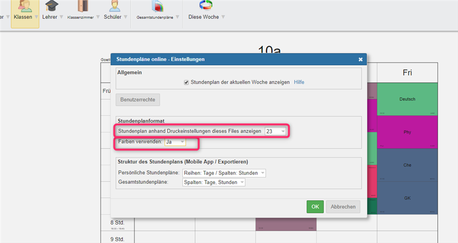 Wenn Sie andere Ansichtseinstellungen des Stundenplans anpassen möchten - Texte auf den Karten, Ausrichtung, Schriftgröße, Ansichtsstruktur, etc...., gehen Sie die Druckeinstellungen in Stundenplan Online und speichern Sie den geänderten Stundenplan erneut ab.