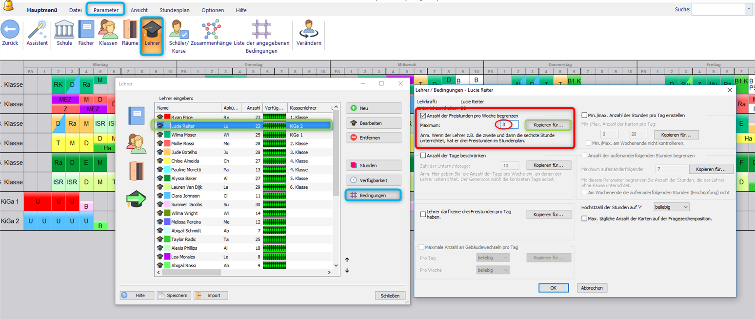 Sie können die maximale Anzahl an Freistunden pro Woche direkt in den Einstellungen unter Parameter angeben, damit Sie einen Überblick über die anfallenden Hohlstunden aller Lehrpersonen in Ihrem Stundenplan behalten.