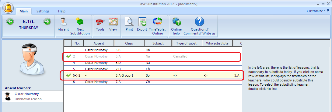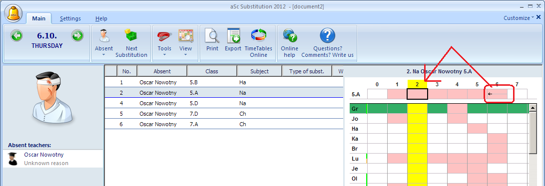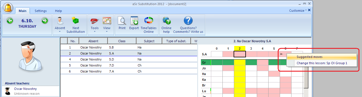 The following picture shows that software noticed that you do not need to substitute the 2nd lesson. Instead of assigning new teacher, you can move the lesson from 6th period to 2nd because 6th lesson's teacher has free time: