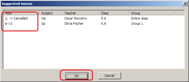 A following dialog appears. As you can see the software suggests to cancel 2nd lesson and move 5th to 2nd.