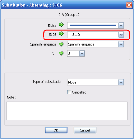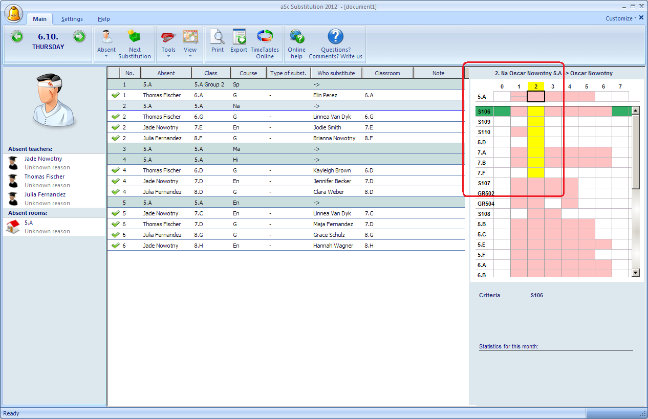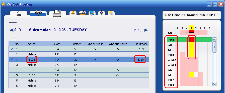 Once inputted the software show the lesson's for which you have to find another room. These are shown in different color then the regular substitutions: