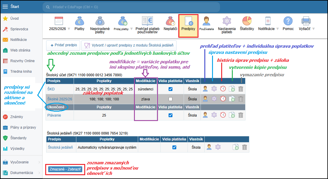 nový poplatok, predpis, školné, stravné, ŠKD, krúžky, špecifický symbol, splatnosť predpisu, viditeľnosť predpisu, bankový účet, história predpisu, ukončené predpisy,