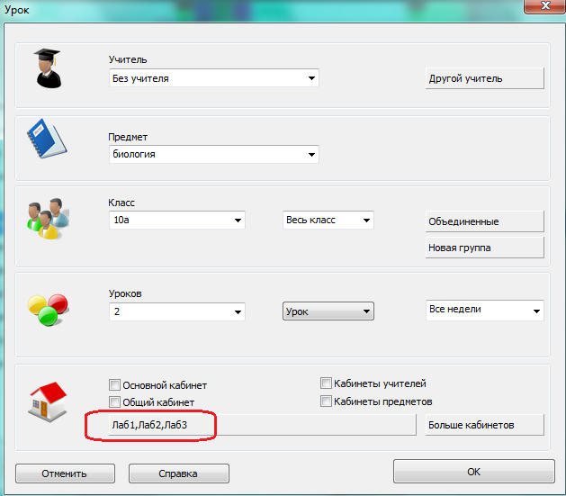 Допустим, что у 10А класса есть 2 урока биологии в неделю. Эти уроки могут проходить в любой из трех лабораторий, Лаб1, Лаб2 или Лаб3. Программа может выбрать одну, но она должна быть та же для всех 2 уроков.