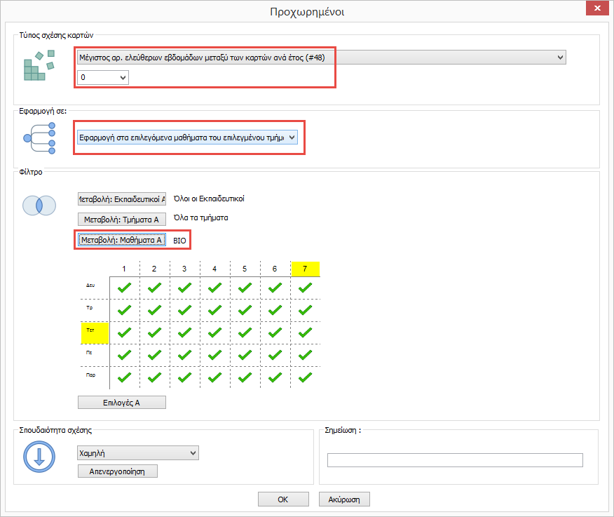 Εάν έχετε μάθημα που πρέπει να είναι σε δύο συνεχόμενα εξάμηνα, μπορείτε να εισάγετε την παρακάτω προχωρημένη σχέση καρτών.