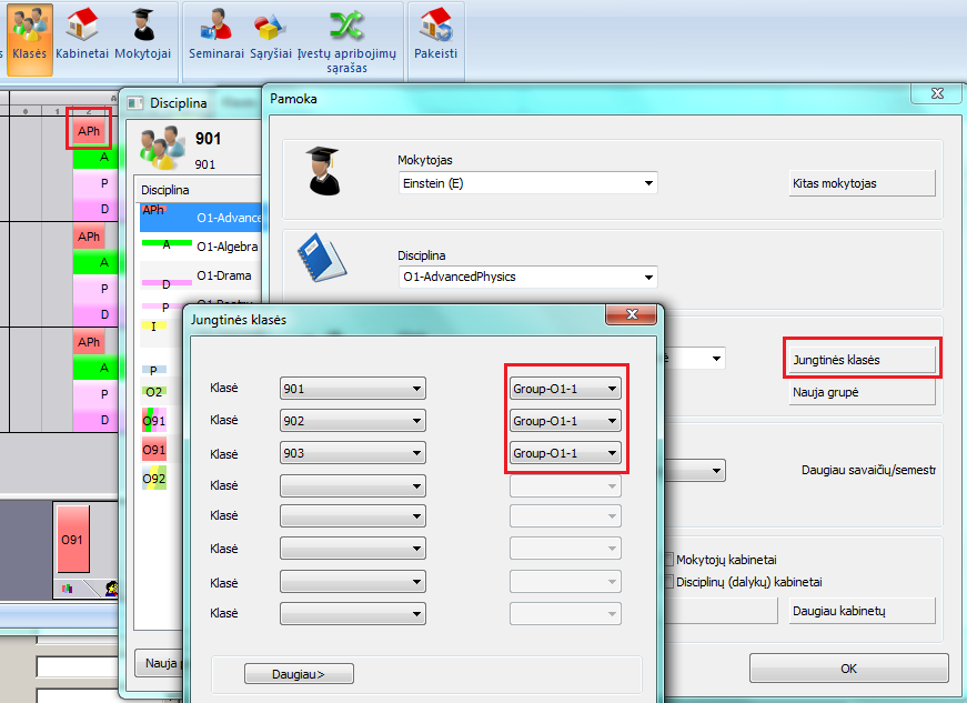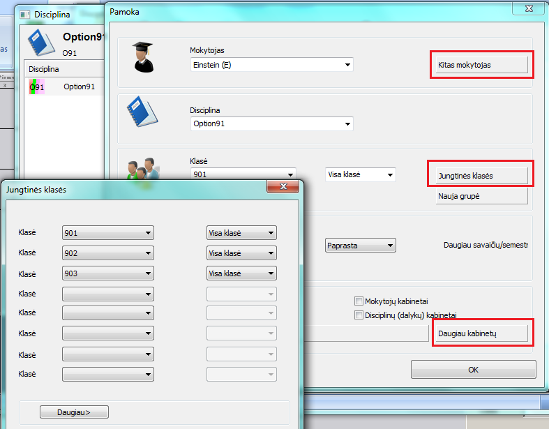 Po to reikia įvesti 4 pamokas "Pasirinkimui 91" - įvedant vieną mokytoją, vieną discipliną ir sujungiant 3 klases (analogiškai ir "Pasirinkimui 92"):