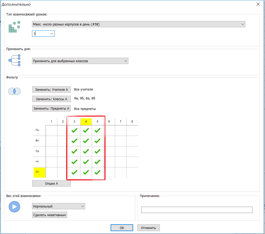 Для любых классов/учителей/предметов или же отдельных учащихся Вы можете указать максимальное число различных корпусов тот день, когда данный объект должен иметь уроки.