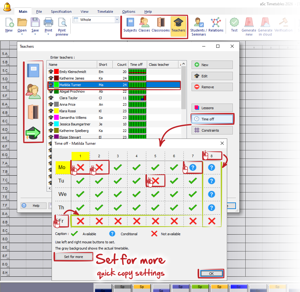 For classes, teachers, classrooms and subjects you can define so called "Time-off". It defines when lessons can be (green), and when they cannot be (red). You can also define so called "question marked positions", where lessons can be, but you wish to avoid having lessons there: