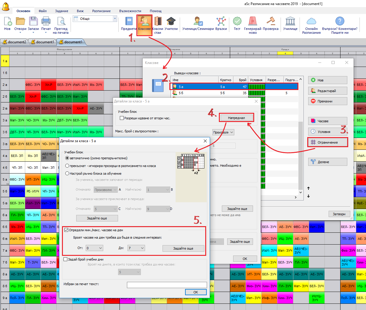 Ако използвате автоматичен блок с учебни часове, се изчислява като 6-8 часа на ден; софтуерът няма да постави девети час на ден. Но можете да обозначите, че желаете максимум седем часа. Отворете меню Класове/Органичения/Напреднал: