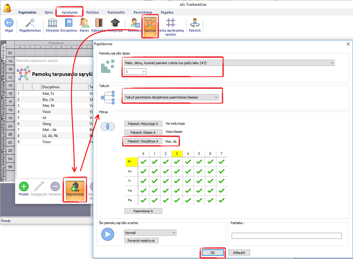 - dažniausiai tokių apribojimų nereikia naudoti, nes programa, sudarydama tvarkaraštį, pamokas deda atsitiktinai, todėl jos ir taip bus skirtingose pozicijose.