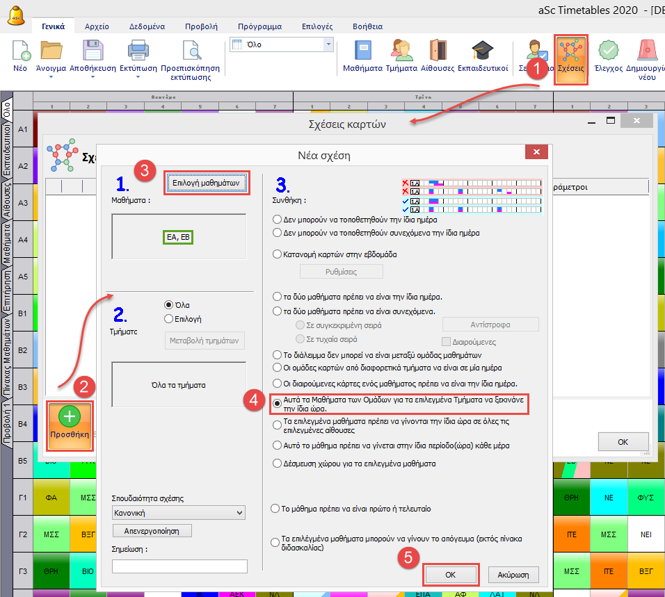 Προσοχή: Στις περισσότερες περιπτώσεις δεν χρειάζεται μα ορίσετε σχέση επειδή έχετε αναθέσει τις διδασκαλίες σε ομάδες από την ίδια κατηγορία. Δείτε Και οι δύο ομάδες πρέπει να τελειώσουν τις διδασκαλίες τους την ίδια ώρα!