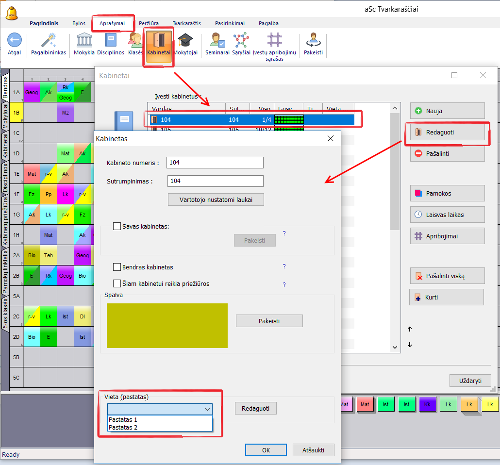 Pastaba: Šios informacijos į programą įrašyti nereikia, jeigu Jūsų mokymo įstaiga yra tik viename pastate arba sudarant tvarkaraštį nėra svarbu, kad vyksta perėjimai į kitą pastatą.