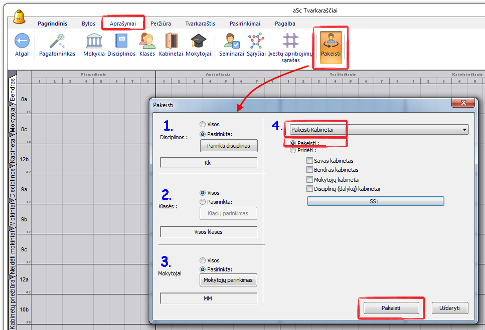 Pakeisti kabinetų paskyrimą pamokoms (vienai ar kelioms bei visoms iš karto) galima pasirinkus meniu "Aprašymai, Pakeisti...".