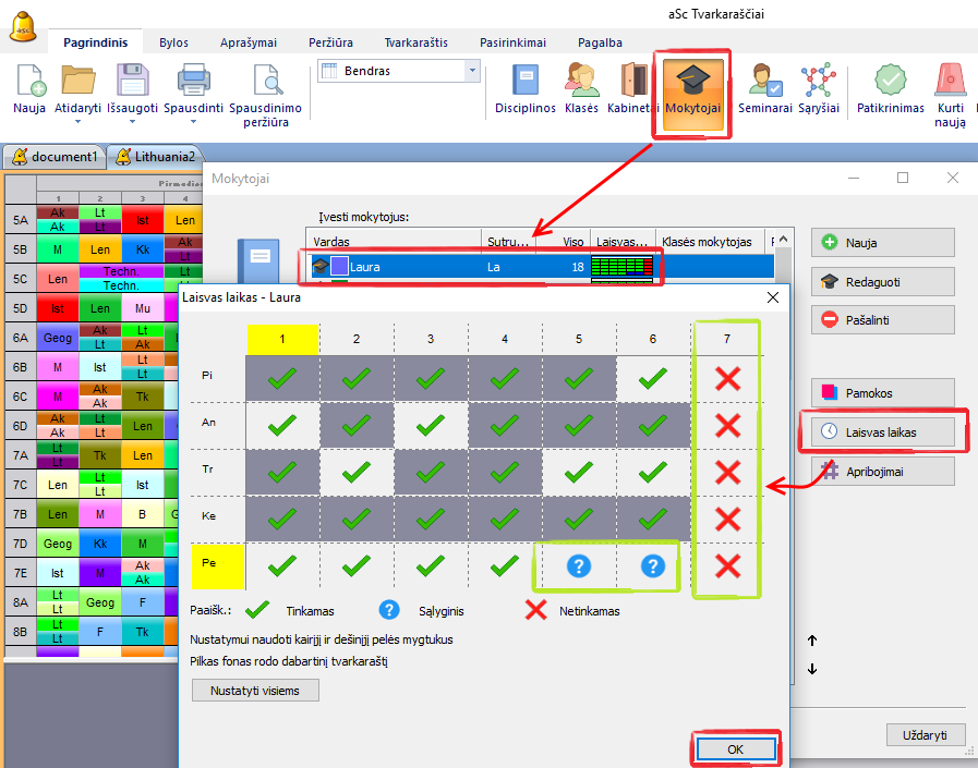 Mokytojų darbo ir laisvas laikas keičiamas lygiai taip pat, kaip ir klasių laisvas laikas, nurodant, kada mokytojas gali vesti pamokas, kada negali ir kada laikas yra abejotinas (nelabai pageidaujamas, ar sąlyginis, t.y. pamoka gali vykti tuo laiku, bet tai nėra pageidautina - į jį programa įdės pamoką, jei neras tinkamesnio laiko perioduose, pažymėtuose žaliu paukščiuku). Šį langą atidarysite pasirinkę "Aprašymai, Mokytojai, Laisvas laikas".