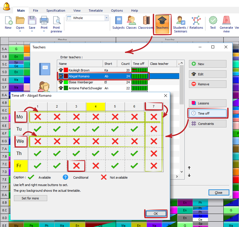 In Teachers dialog you can specify when each teacher can teach. It is possible to set this in menu Specification - Teachers - Time off.