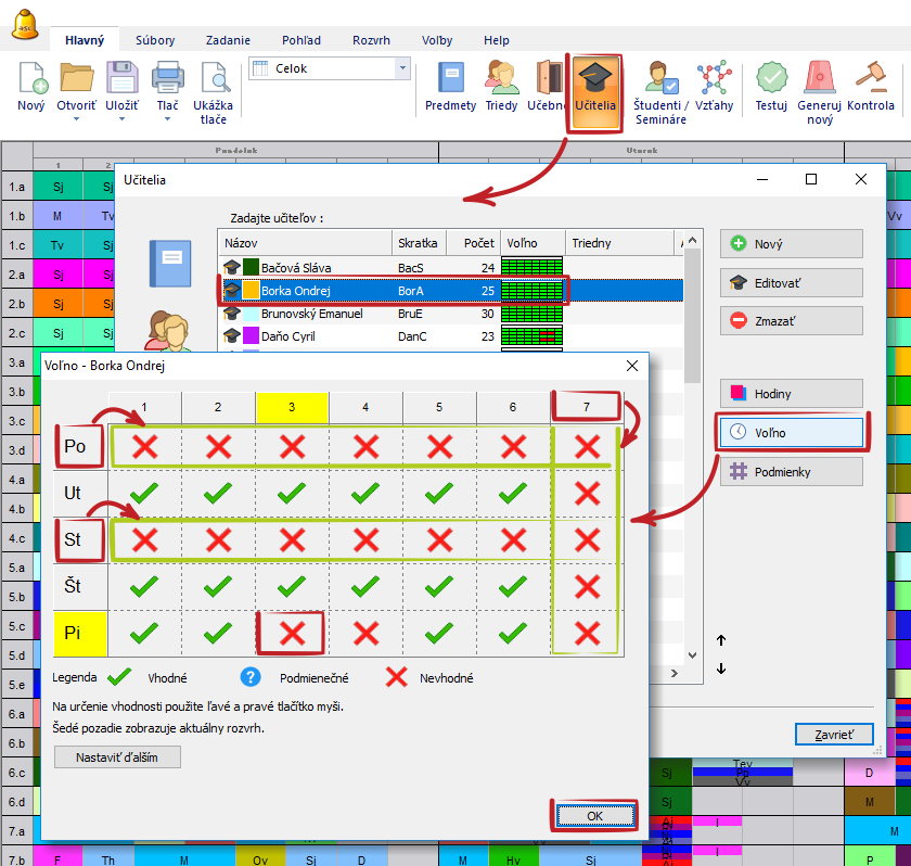 V dialógu Učitelia môžete zadať, kedy každý učiteľ môže vyučovať. Dá sa to nastaviť v menu Hlavný - Učitelia - Voľno.