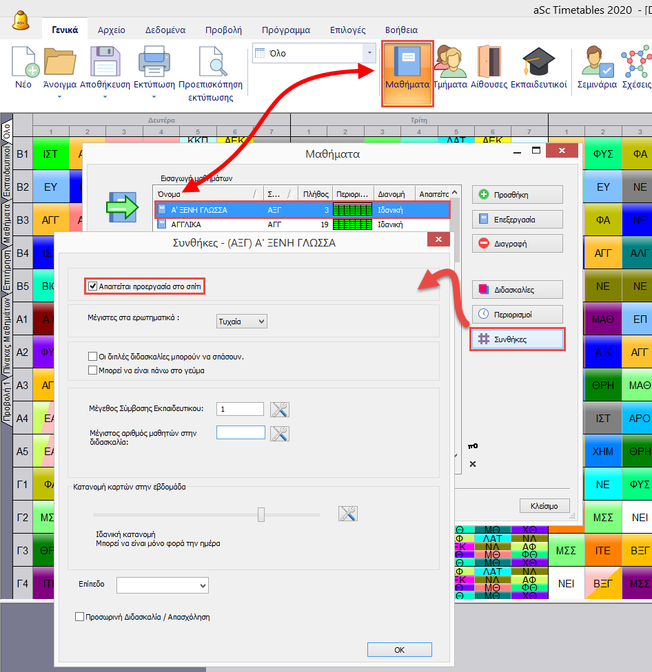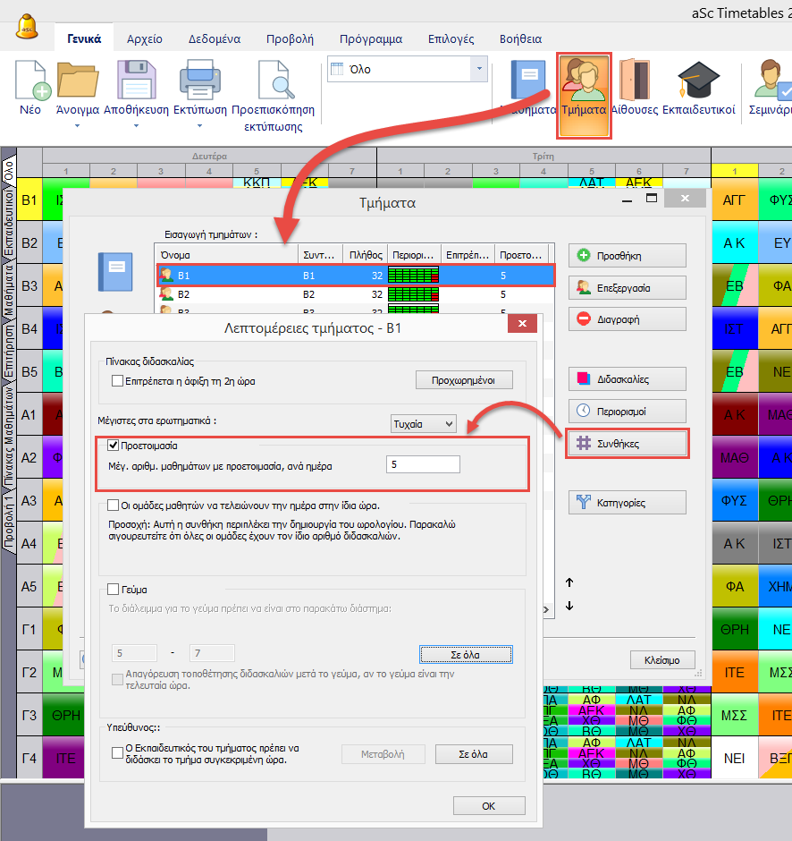 Μπορείτε μετά να ορίσετε τον μέγιστο αριθμό διδασκαλιών που απαιτούν προεργασία στο σπίτι. Για να το ορίσετε αυτό, ξεχωριστά για κάθε τμήμα, ακολουθήστε την παρακάτω εικόνα.