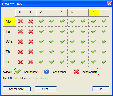 ניתן לבצע את ההתאמת השיבוץ/חסימה, על ידי לחיצה על תא מסויים(שעור מסויים), כותרת שורה (יום מסויים) או כותרות עמודות (שעור מסויים בכל ימות השבוע).