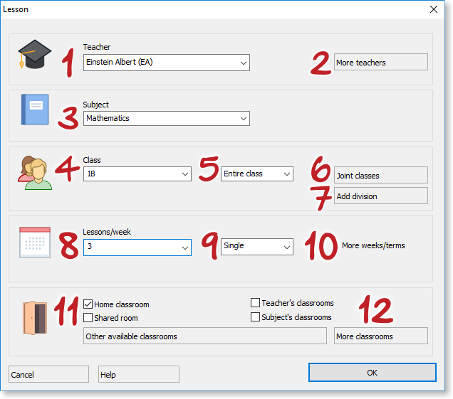 Once you have created all of the four main items - subjects, classes, classrooms and teachers - you can start to create these lessons. Select the item (e.g. teacher "Einstein") - click the button Lessons - in a new dialog use the button New lesson.