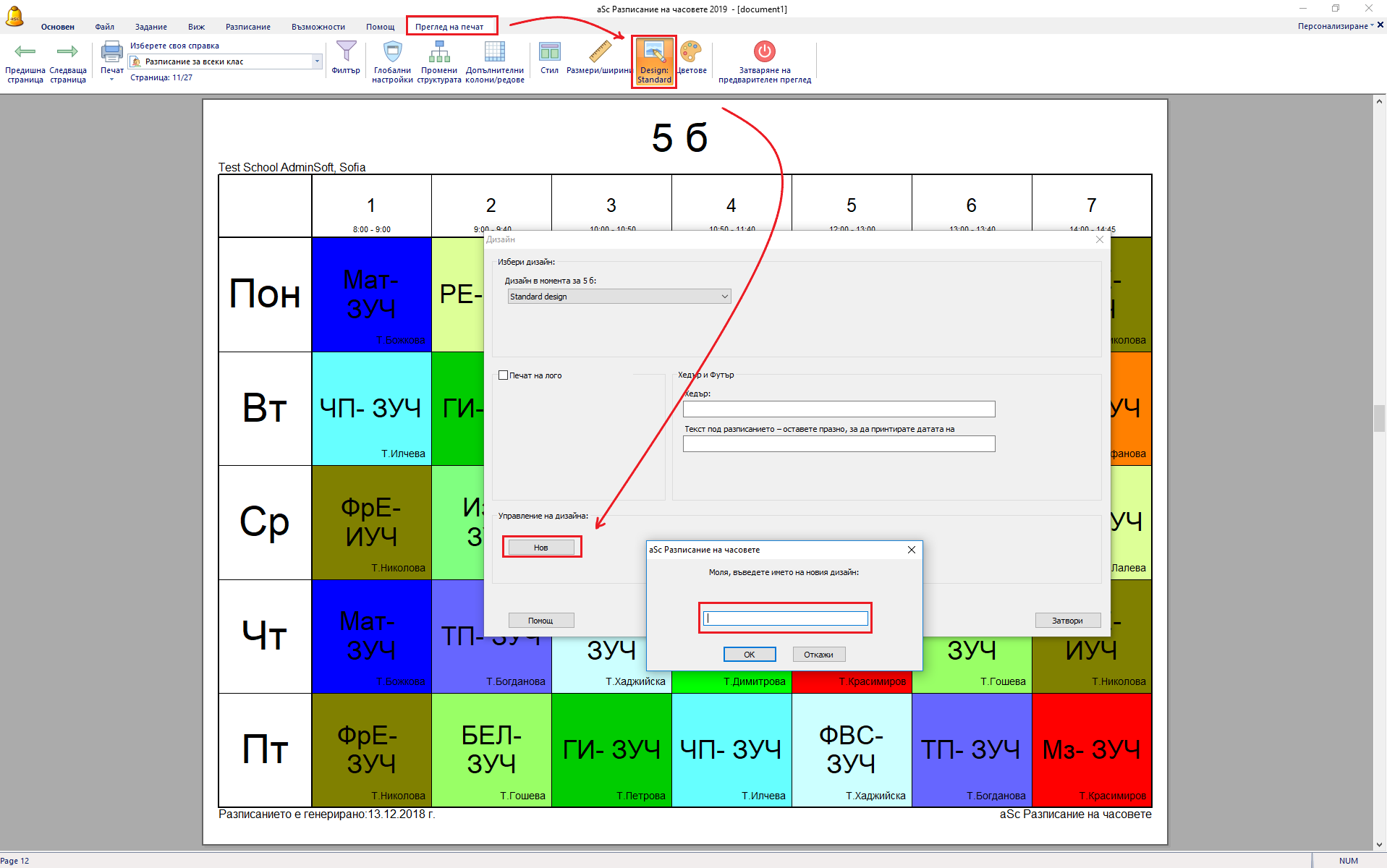 След това трябва да приложите към избраните класове или учители като отворите меню Преглед на предпечат/ Дизайн и от „Управление на дизайн“ да изберете Нов