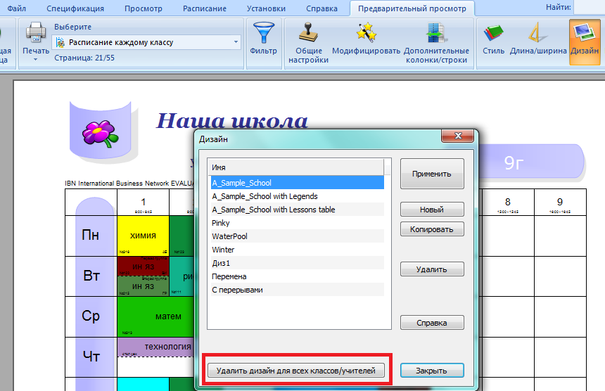 Или Вы можете удалить дизайн из расписания, так, чтобы все расписания были напечатаны без элементов дизайна: