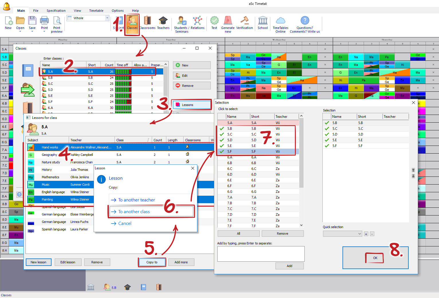 Note 2: If you want to modify the lessons that are being copied a bit more, select them using CTRL and press 'Add more' button. Here you can change more then just class before the lessons are added back into the timetable. See: