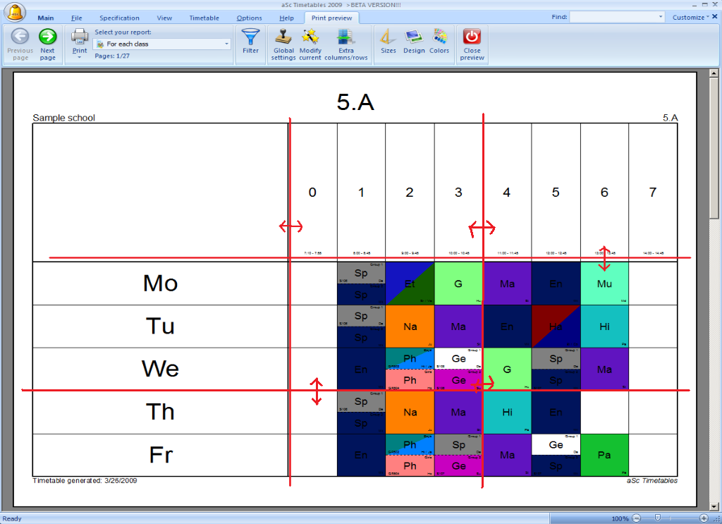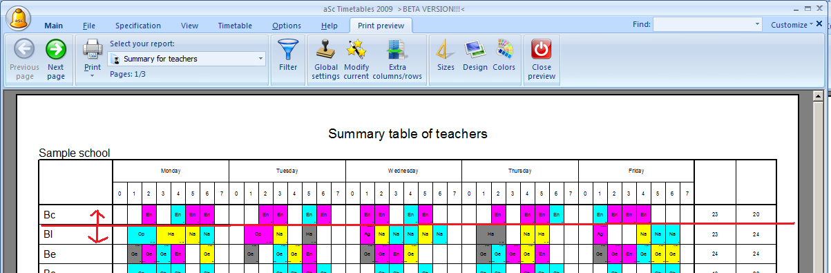 For example, summary timetable of teachers is fit to width, but not fit to height so you can set the height of the rows. IF there are more rows, the printout will continue onto the next page:
