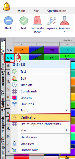 If you want to show problems of just one class or teachers in the current timetable you can right click on its/his row headers and select "Verification".