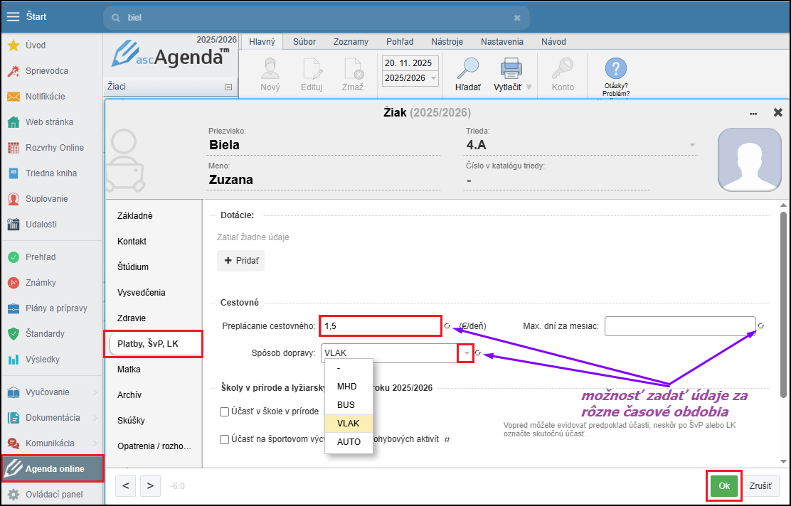 Denné cestovné náklady na dopravu žiaka evidujete v karte žiaka v Agende Online - záložka Platby, ŠvP, LK. Môžete zadať výšku denných cestovných nákladov, spôsob dopravy a maximálny počet dní za mesiac, za ktoré sa má cestovné preplácať, všetky tieto údaje môžete zadať tiež za rôzne časové obdobia.