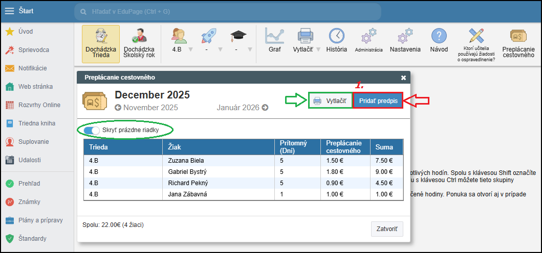 Preplácanie cestovného vám poskytuje náhľad koľko má byť každému žiakovi vyplatené za daný mesiac. Systém automaticky vypočíta sumu za každý mesiac na základe dochádzky žiaka a zadaných denných cestovných nákladov na dopravu žiaka. Nemusíte teda už nič prepočítavať a ušetríte si čas. V prípade, že nechcete aby sa pre určitý typ absencie cestovné počítalo (reprezentácia, exkurzia), tak pozrite tento návod. Ako zadať aby sa príspevok na dopravu žiakov pre určitý typ absencie nepočítal