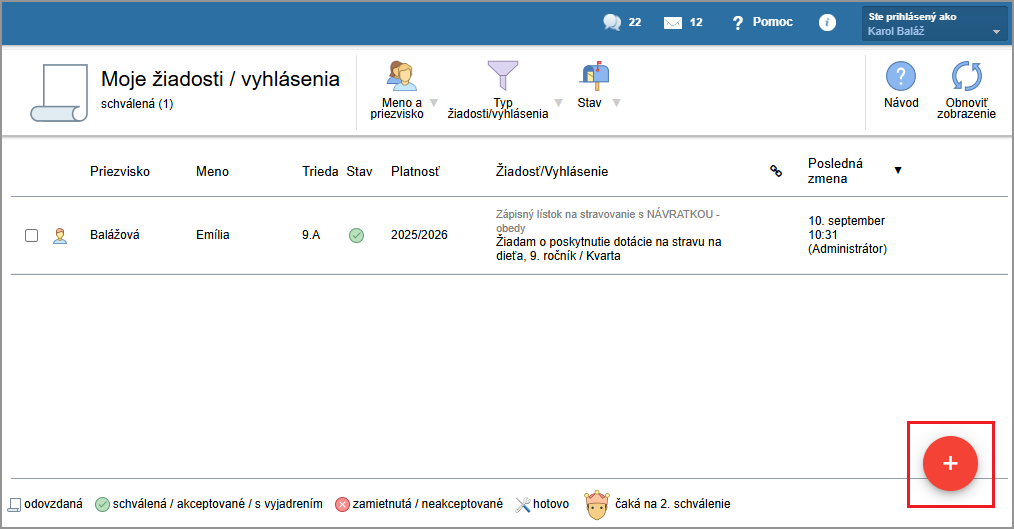 V module Žiadosti / Vyhlásenia kliknite na červené '+'.