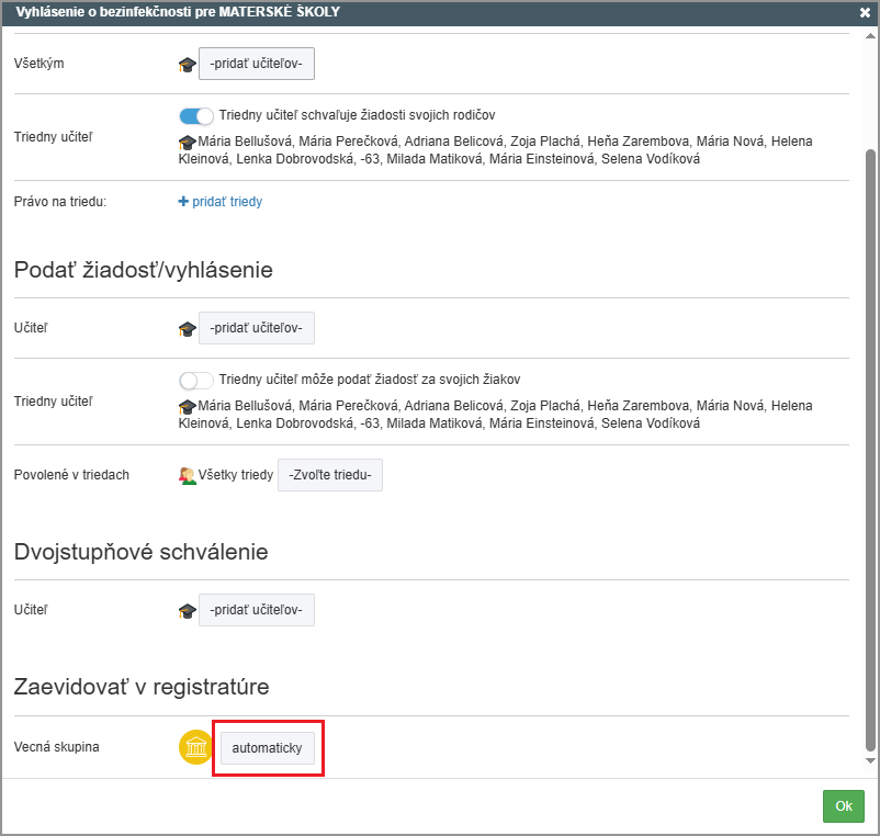 Niektoré žiadosti už majú prednastavenú vecnú skupinu, v ktorej sa žiadosť pri schvaľovaní automaticky zaeviduje.