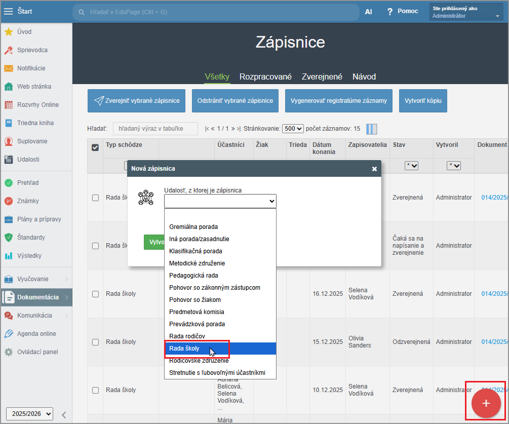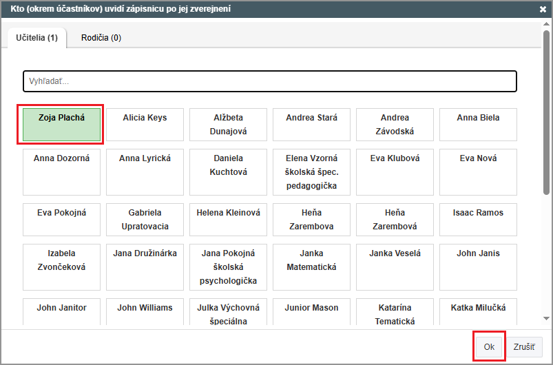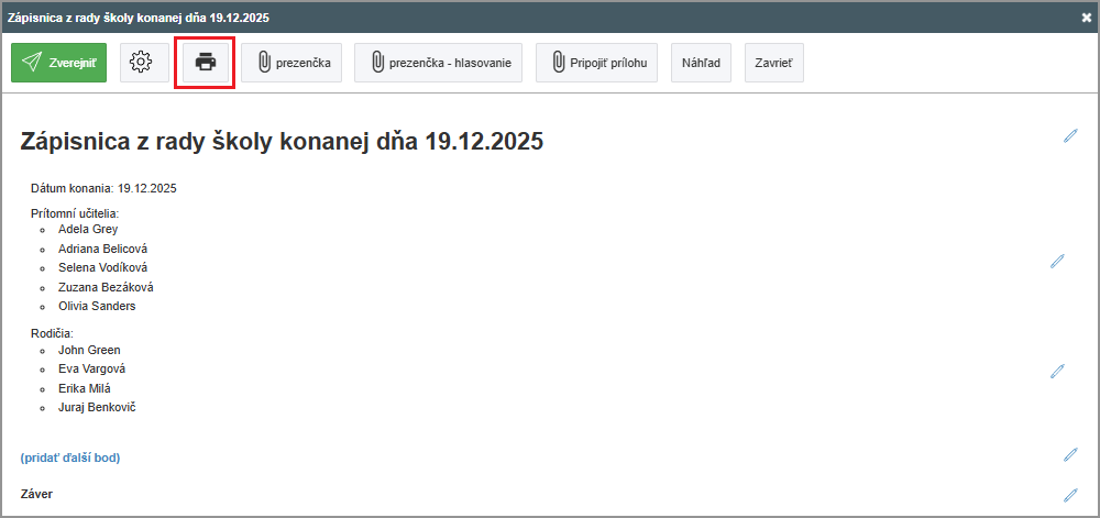 Po zverejnení zápisnice je prezenčná listina viditeľná pre učiteľov a zriaďovateľa. Rodičia prezenčnú listinu nevidia.
