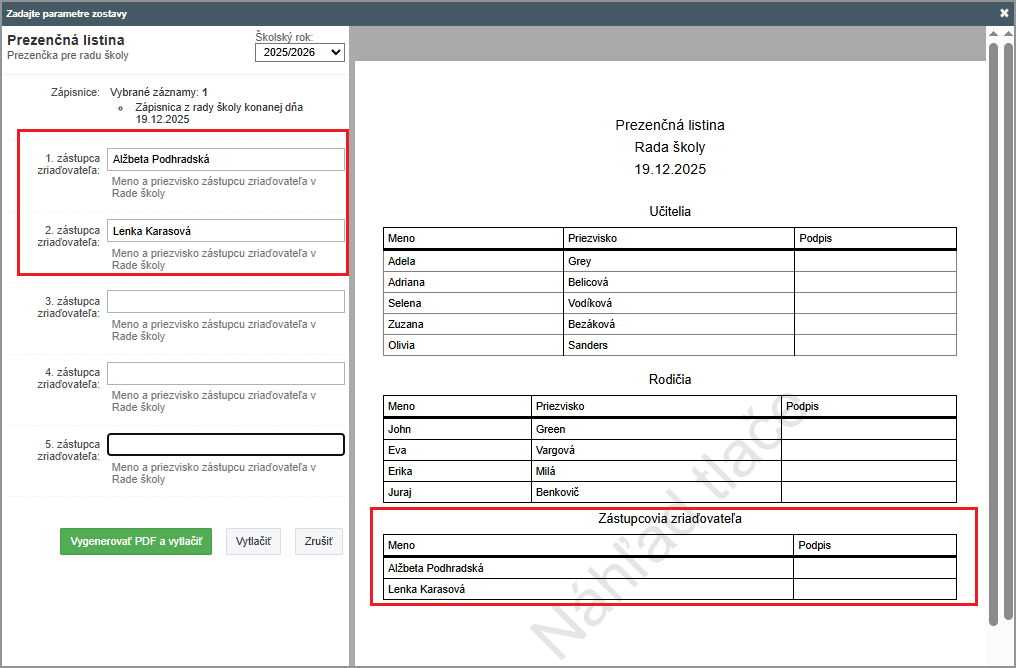 Členmi Rady školy sú aj zástupcovia zriaďovateľa. Tých je možné pred vytlačením prezenčnej listiny doplniť.