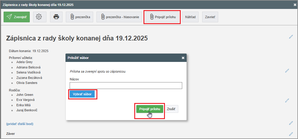 Túto prílohu môže pridať iba administrátor alebo učiteľ s právami administrátora pre modul Zápisnice a Prihlasovanie/Ankety