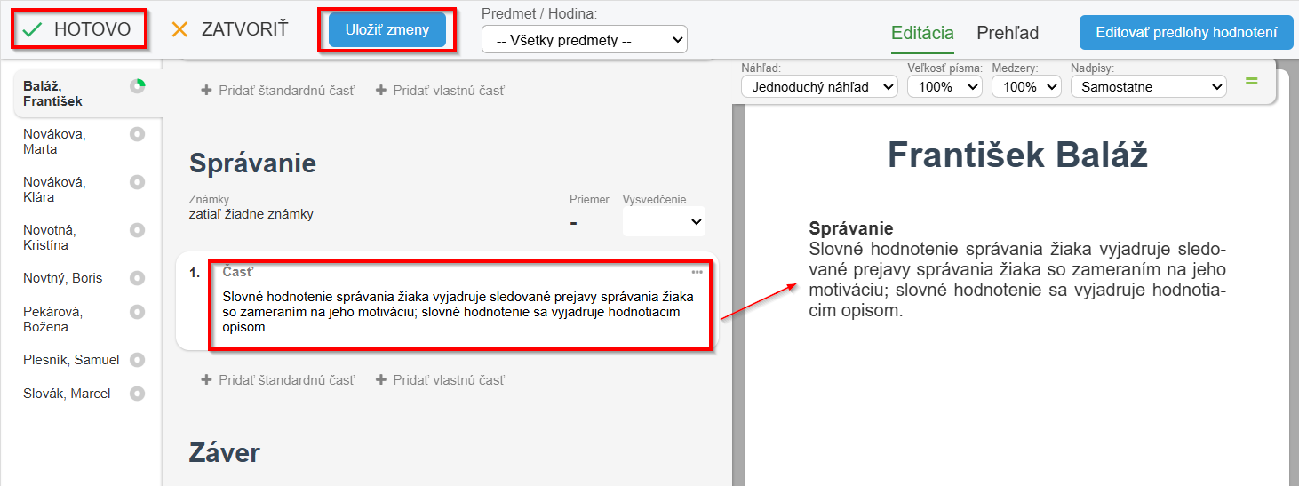 Ako zadám slovné hodnotenie z predmetu Správanie