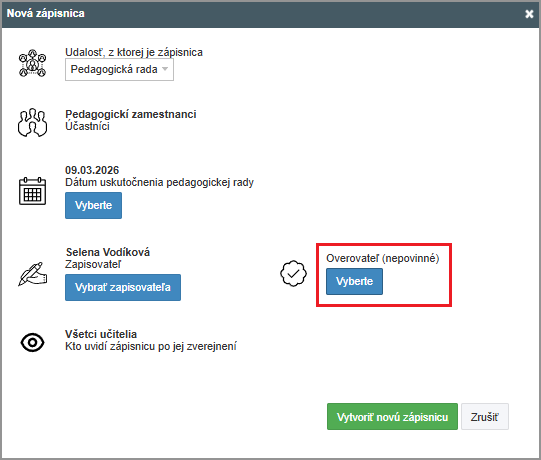 V Zápisnici máte možnosť okrem zapisovateľa zvoliť aj overovateľa.