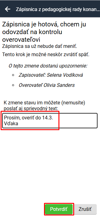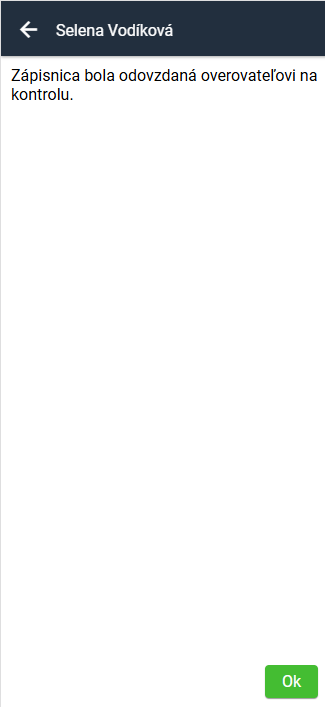 Systém zapisovateľa upozorní, že posiela zápisnicu na overovateľovi.