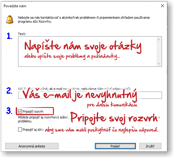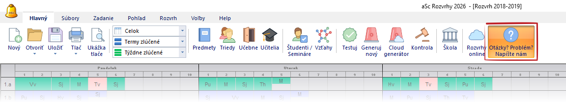 V prípade, že máte nejaké otázky alebo potrebujete pomoc s rozvrhom, na ktorom práve pracujete, môžete nám napísať priamo zo softvéru ASC Rozvrhy. Či už v offline verzii alebo aj v online rozvrhoch stačí ak jednoducho kliknite na modrú ikonu s otáznikom