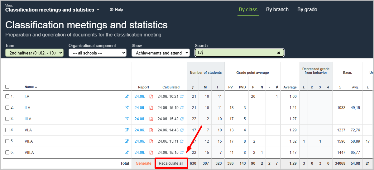 The administrator can recalculate statistics for all classes at once by clicking the Recalculate All button located below the list of classes.