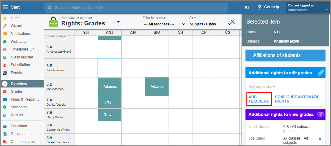 Click on any course (lesson). In the "Additional rights to editi grades" section on the right side of the screen, select "Add teachers."