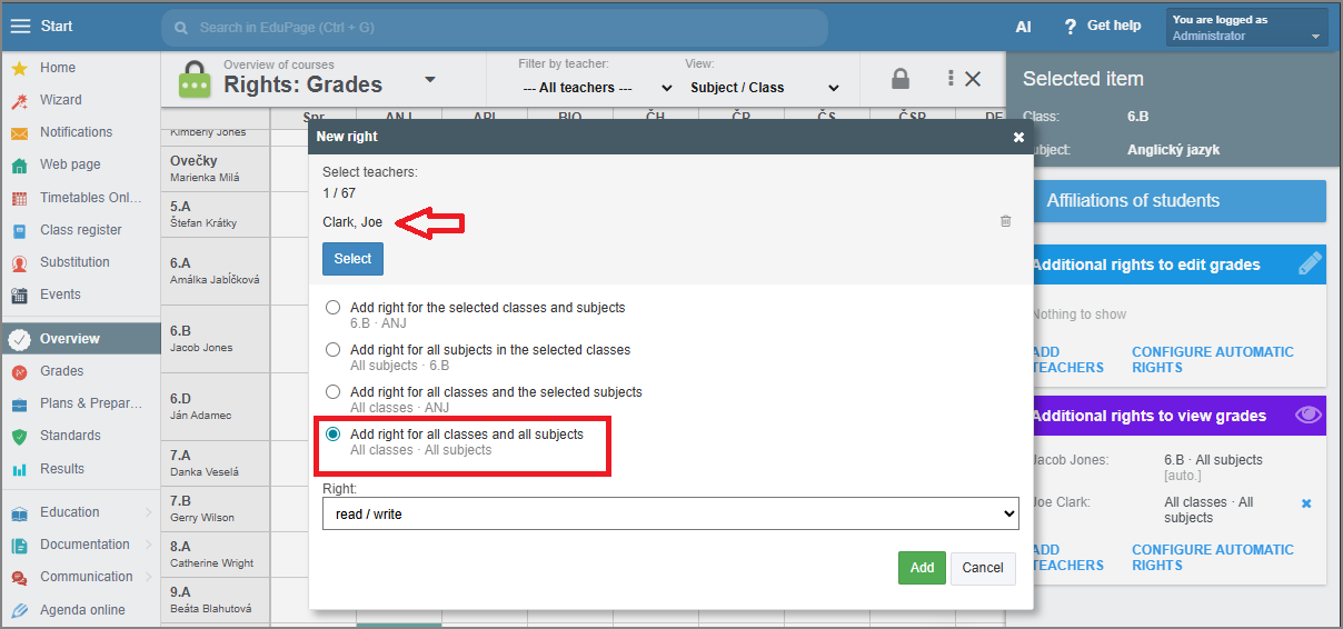 Select the teacher and choose the type of right.