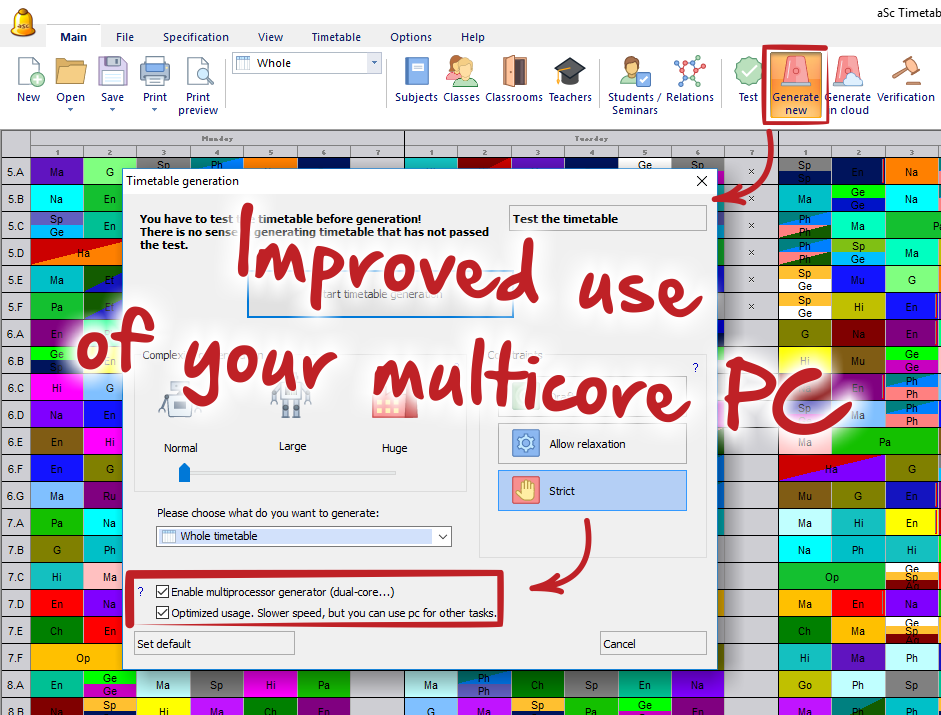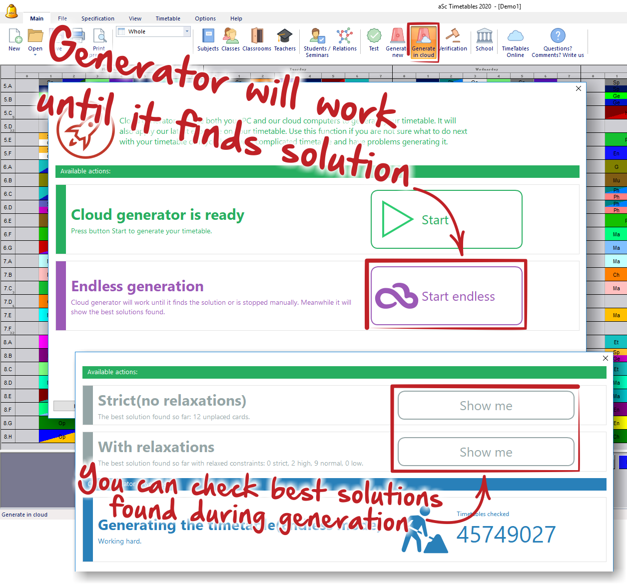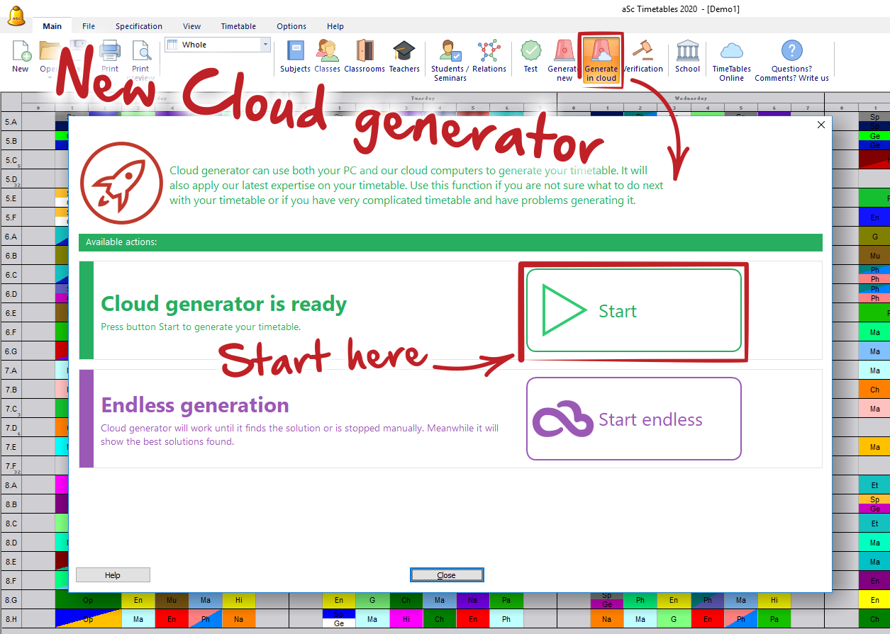 3. Cloud generator. The new function cloud generator uses both the power of your computer and our servers in the cloud. This mode is especially useful for timetables where you do not know if they can be generated, what parameters and complexity to use etc. The cloud server will take care of this. It has some experience - collected from generating many different timetables and with this new feature we are trying to put this experience to work and help you with generating your timetable.