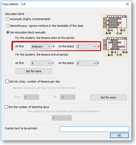 This automatic teaching block calculation is good for most of the schools. However if the class has 32 lessons and you want to allow 5-9 lessons each day, you have to set the teaching block manually.