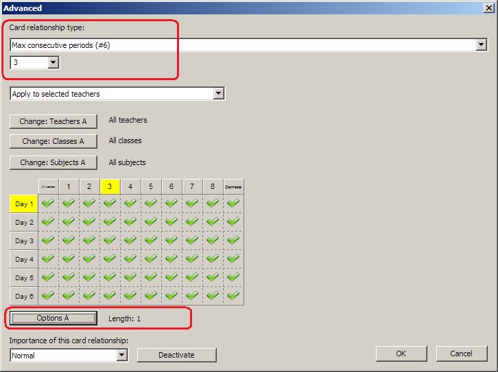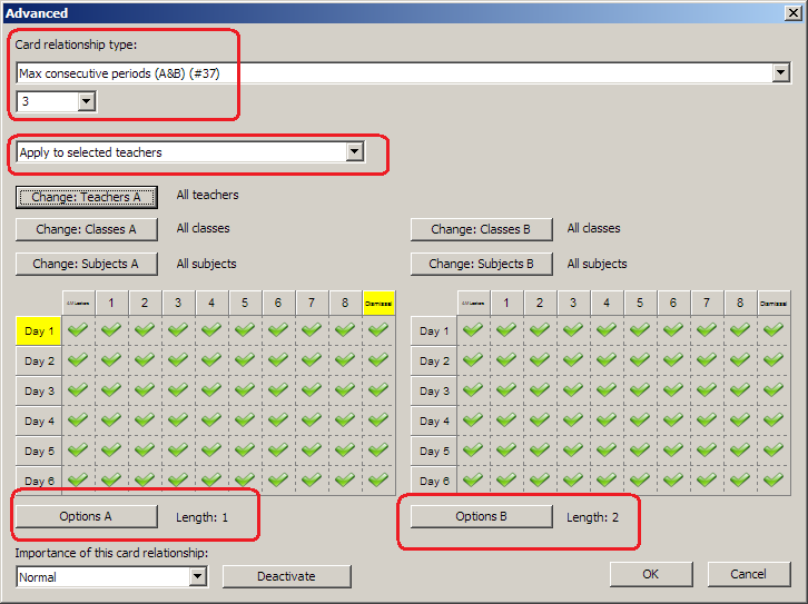 in both cardrelationships you might want to select relevant subjects, so that for example teachers preparation time and lunch are not counted into the consecutive periods count.