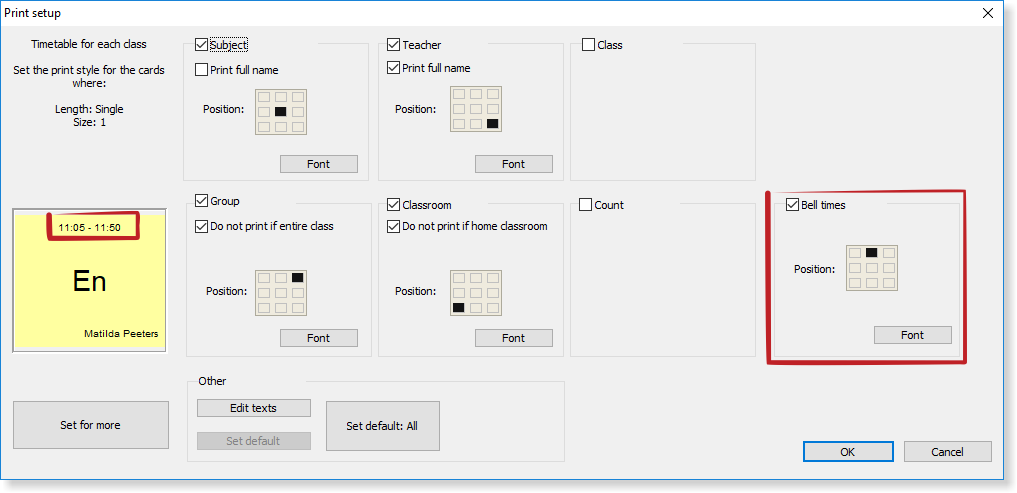 In case you have diffent bells in some parts of the school or on some days, then you can print the bell time directly on the cards, right click on them in the print preview and select that you want to print the bells on cards: