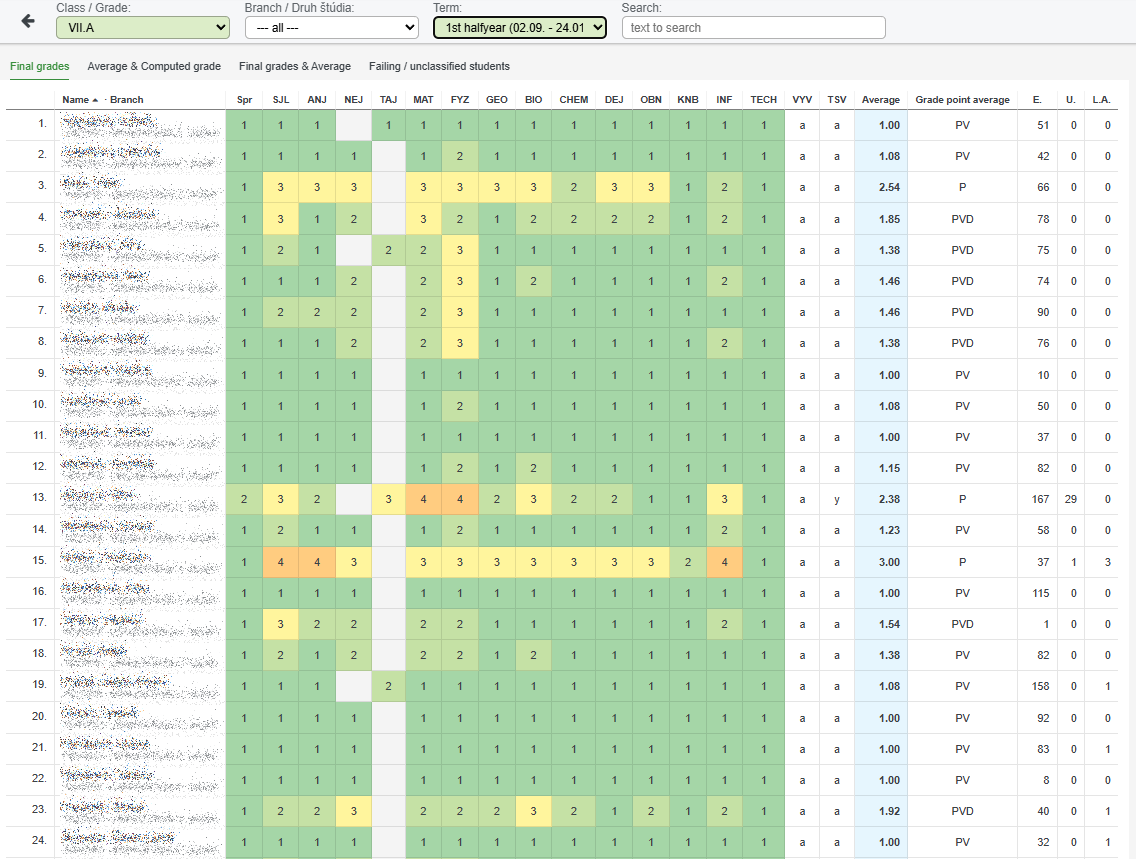 Since teachers rarely enter grades for the 1/4‑year and 3/4‑year periods, EduPage calculates them in the grading statistics.