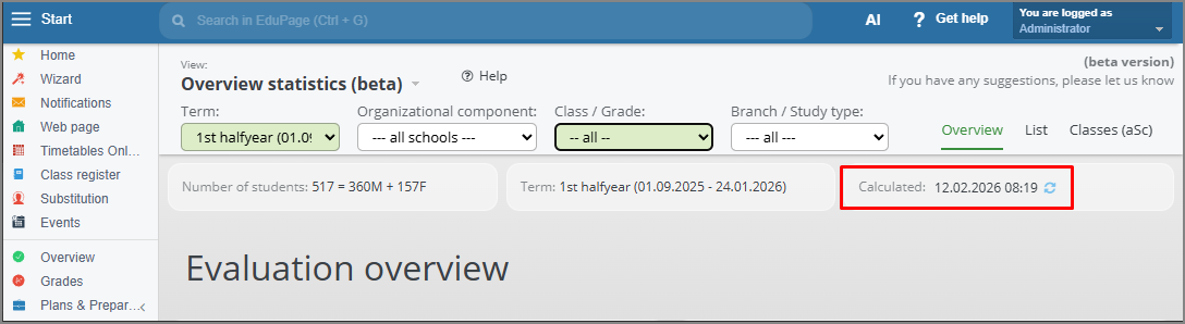 If the data in the statistics has not been recalculated for a longer period of time, the system will display a warning indicating that the statistics need to be recalculated.