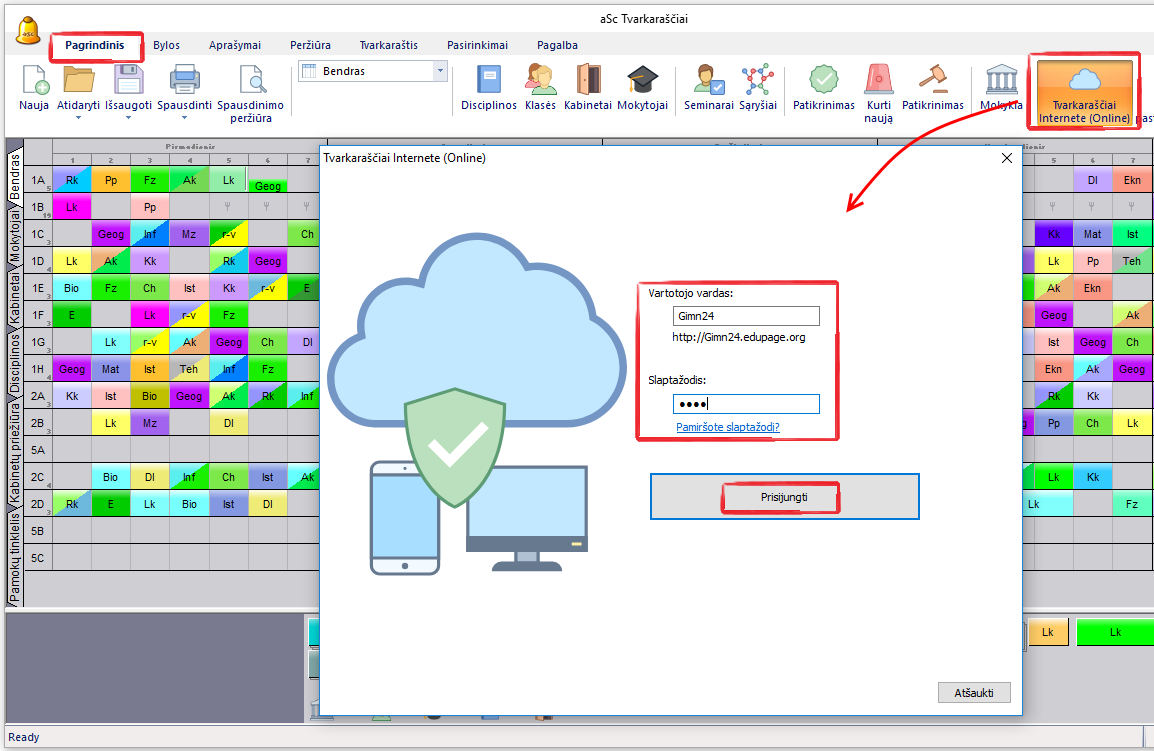 Prisijunkite su savo administratoriaus vardu ir slaptažodžiu, arba galite prisijungti ir su mokytojo, turinčio teisę skelbti tvarkaraštį, paskyra.