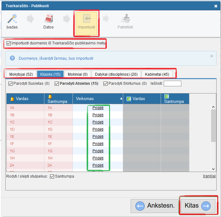 Kitu žingsniu galima importuoti visus duomenis iš tvarkaraščio į "Tvarkaraščius Internete".